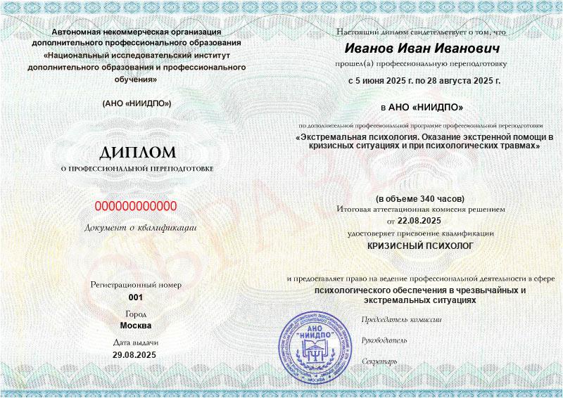 - Изучили психологию экстремальных состояний и ситуаций, получили диплом о профессиональной переподготовке с присвоением квалификации «кризисный психолог» — можете устроиться в организации и открыть частную практику.