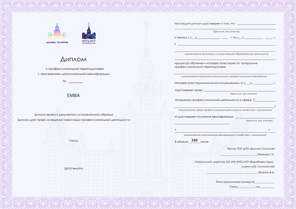 Два диплома: диплом установленного образца от «Долины Талантов» — образовательной организации при Инновационном научно-технологическом центре МГУ «Воробьевы горы» — и диплом о профпереподготовке АНО «НИИДПО»