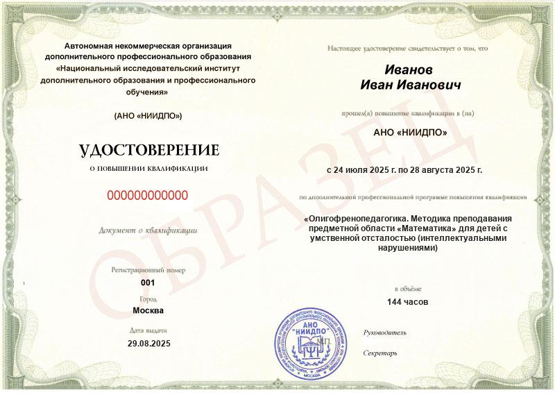 Олигофренопедагогика. Методика преподавания предметной области «Математика» для детей с умственной отсталостью (интеллектуальными нарушениями) в условиях реализации ФГОС (144ч)