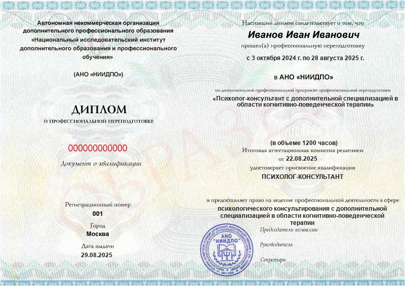 Психолог-консультант с дополнительной специализацией в области когнитивно-поведенческой терапии (1200ч)