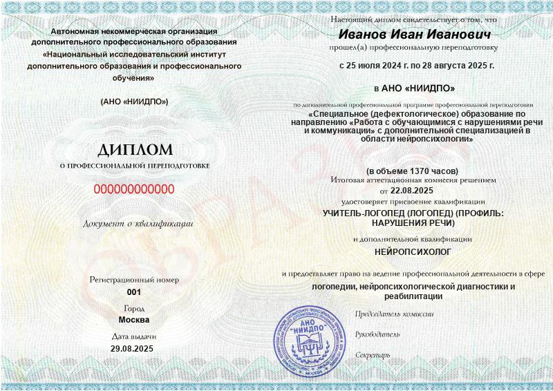 • 2 квалификации: Учитель-логопед (логопед) (профиль: нарушения речи) + Нейропсихолог